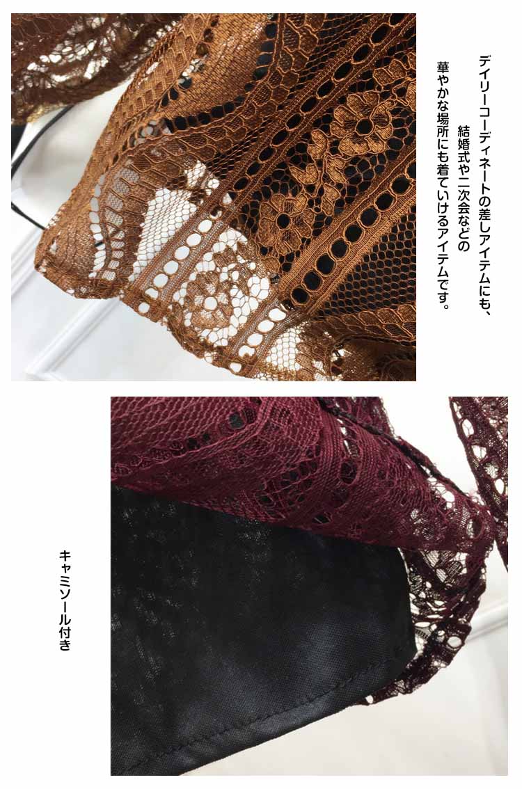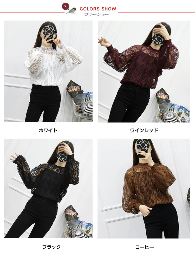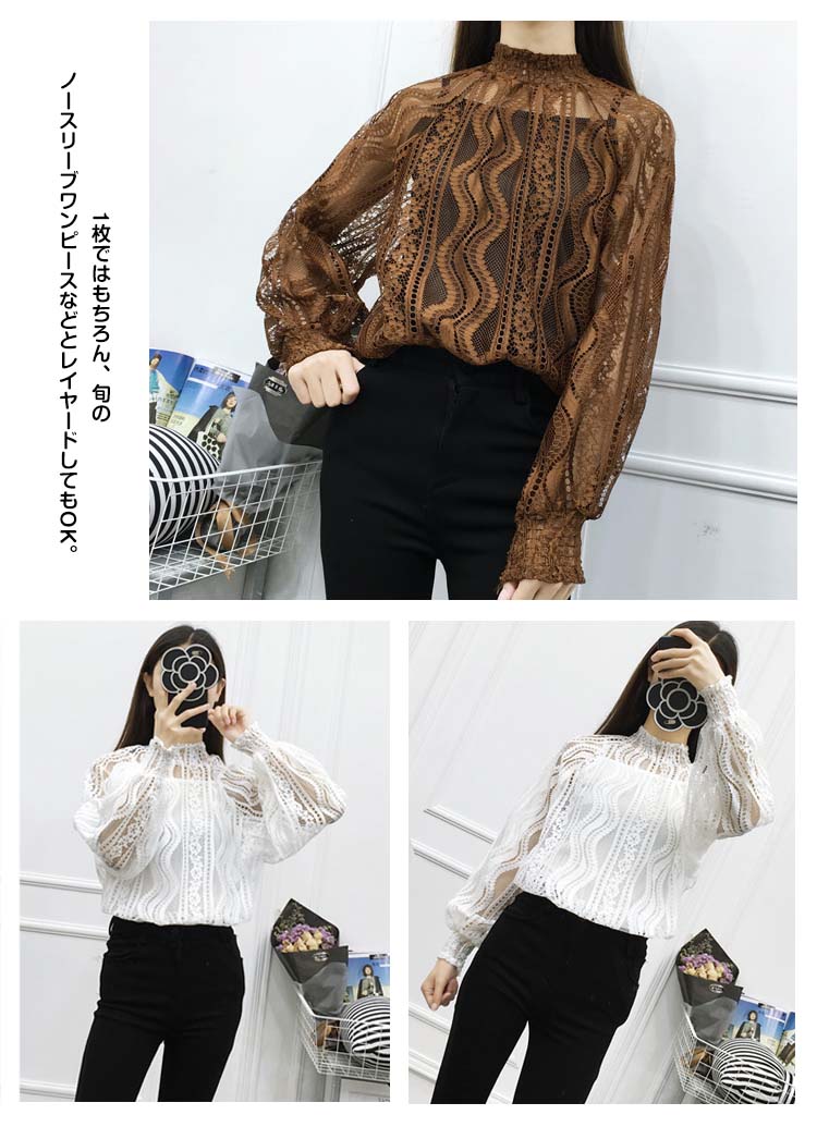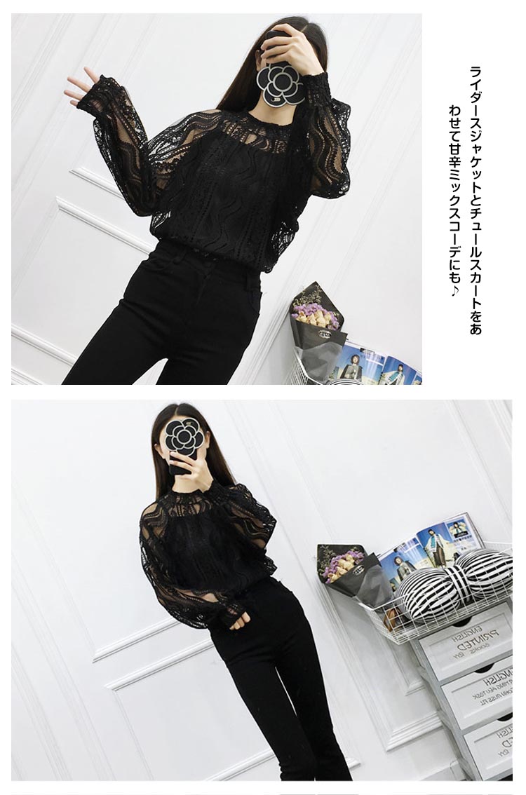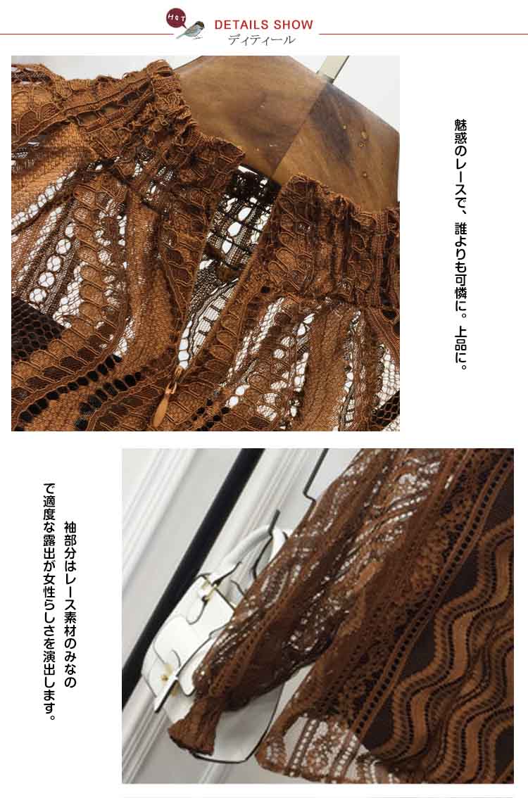 | 透け感のあるフラワーデザインのレーストップスが登場です。 袖に透け感を出して、エレガントでちょっぴりセクシーな雰囲気に仕上げました。 デイリーコーディネートにはもちろん、結婚式や二次会などのイベントにもおすすめな大人上品なレースのブラウス。1枚ではもちろん、旬のノースリーブワンピースなどとレイヤードしてもOK。ライダースジャケットとチュールスカートをあわせて甘辛ミックスコーデにも♪ | |