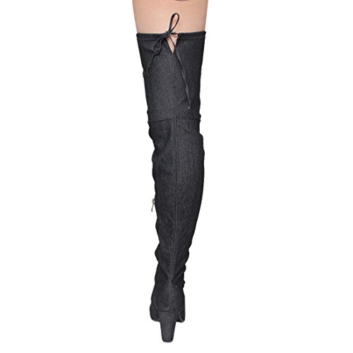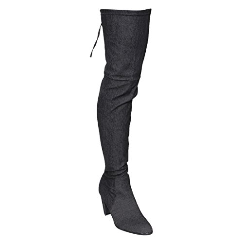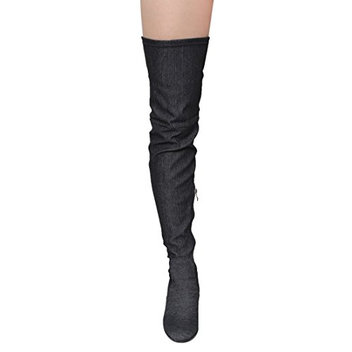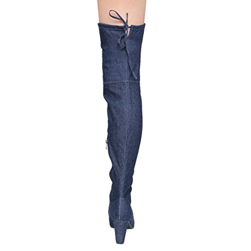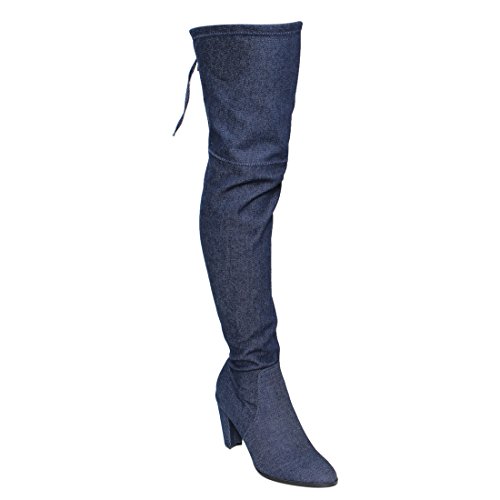 CAPE ROBBIN FE68 Women's Drawstring Denim Over The Knee High Block Heel Boots