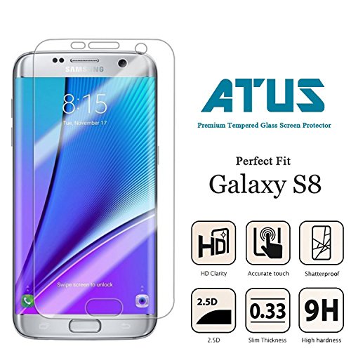 -. Feature : Compatible with: Samsung Galaxy S8. Screen Protector is constructed with exact cut-outs that retains functionalities on your device, including the microphone, camera, etc. / Oleophobic Coating: Special anti-oil coating makes fingerP.R.Int smudges on your screen easy to clean, as it protects against oil, water, and dust from accumulating on the surface. / Premium Protection: Construction from industrial grade materials means material hardness rating of 9H, with protection against scratches, impacts, and shattering. / Beneficial Qualities: ATUS Brand Tempered Glass ensures superiority over other alternatives. The thin 0.3mm glass retains light transmittance for clear display and touch sensitivity natural to the Galaxy S8. / Easy Use and Clean: The Twin Pack Tempered Glass Screen Protector for Galaxy S8 can be easily installed with no bubbles and no peeling corners.