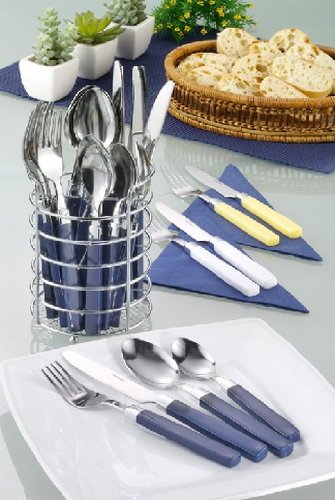 -. Feature : Bestehend aus je 6 Messern, Löffeln, Gabeln und Kaffeelöffeln. / Griffe aus blauem Kunststoff, ein echter Hingucker auf jedem gedeckten Tisch. / Der Clou: inkl. verchromten Besteckkorb - so hat man schnell alle Besteckteile griffbereit / Das Besteck eignet sich ideal für den täglichen Gebrauch oder für junge Haushalte