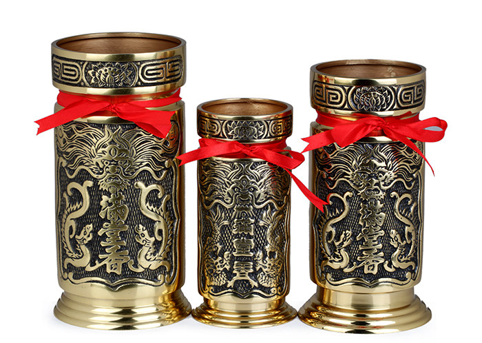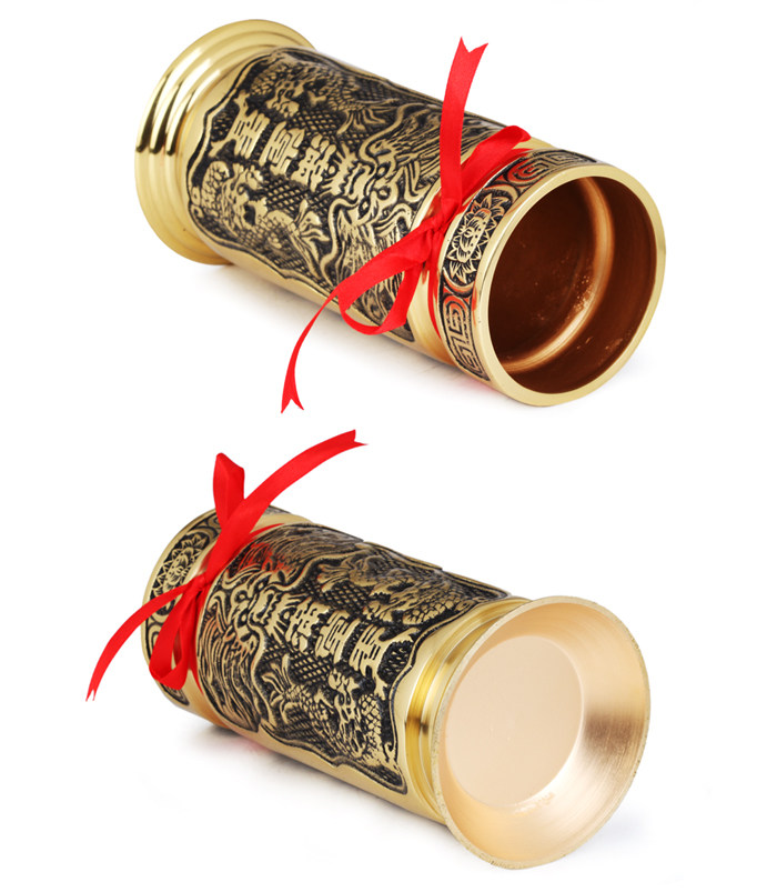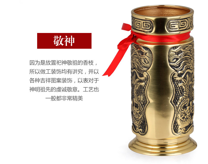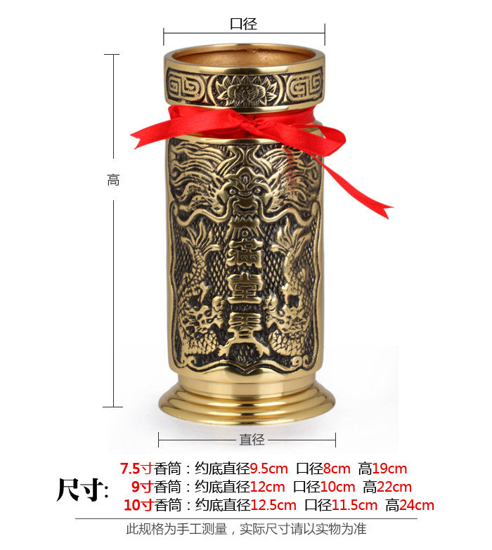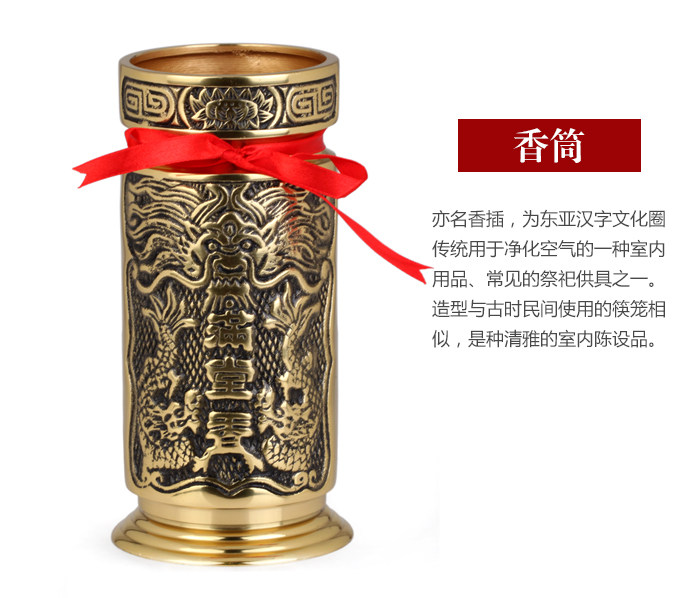 Product features: Incense tube, also known as incense, which is one of the commonworship an indoor air purification products, for Chinese characters of traditional culture of East asia. Modeling and ancient folk use chopsticks cage is similar, an elegant furnishings. Product introduction: Name: full Xiangxiang cylinder Material: Copper Size: 7.5 inch incense tube: about bottom diameter 9.5cm caliber 8cmhigh 19cm 9 inch incense tube: about bottom diameter 12cm caliber 10cm high 22cm 10 inch incense tube: about bottom diameter 12.5cm caliber 11.5cm high 24cm Weight: 7.5 inch incense tube about 1.06kg 9 inch incense tube about 1.93kg, 10 inch incense tube about 2.22kg, Packaging: general packaging |