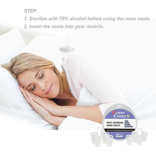 -. Feature : Safe: Made with premium Medical Grade PE, Odor free and BPA free. / Natural: Reducing even stopping snores instantly by maximizing the airflow in the nasal passageways. / Convenient: Easy to insert the vents into the nostrils and simple to clean(Vents are reusable, sterilize with 75% alcohol before using ). / Comfortable: Insert Every Cares vents into the nose, although a bit uncomfortable at first, whittling a few minutes didn't feel them. / Package: 4 PCS in each pack with travel cases, 2 sizes included to suit most people.
