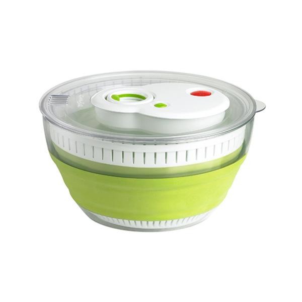 | レバーを引くだけで簡単に水切りができるサラダスピナー!!野菜の量が多い時にも楽に水切りができる「高速回転機能」と、水切り後に簡単に水を流すことが出来る「スリット」を搭載したターボモデルです。折りたたむと高さが半分になり、コンパクトに収納できます。 |