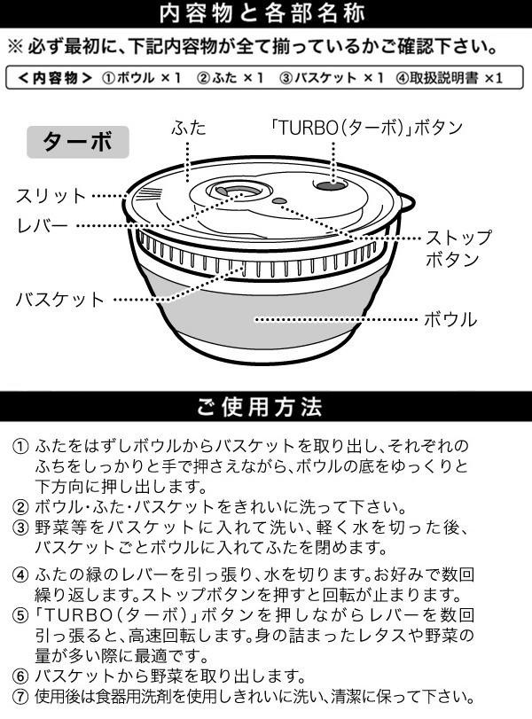 レバーを引くだけで簡単に水切りができるサラダスピナー!!野菜の量が多い時にも楽に水切りができる「高速回転機能」と、水切り後に簡単に水を流すことが出来る「スリット」を搭載したターボモデルです。折りたたむと高さが半分になり、コンパクトに収納できます。 |