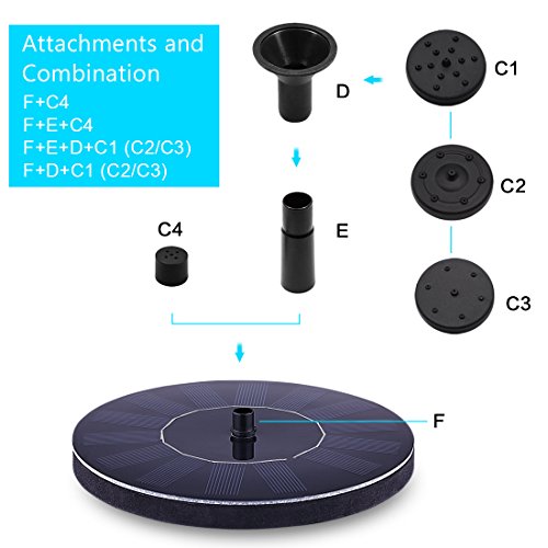 - Four different spray heads: Come with four different spray heads. You can easily change the spray heads to get different water pattern. This is a floating water fountain pump, but if you don't want it floating everywhere, you can also use the suction cup to secure the pump.