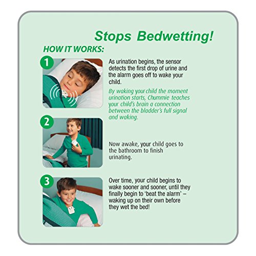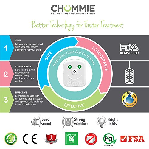 Chummie bedwetting alarms are often recommended as the first line of treatment to stop bedwetting by pediatric urologists. The Chummie alarms have won numerous awards for their novel technology and support. Perfect Bedwetting Alarm for Deep Sleepers Chummie Premium Bedwetting alarm trains even the deepest sleepers to stop bedwetting and sleep dry throughout the night in just a few weeks without medication. As urination begins Chummie’s unique bedwetting sensor detects the first drop of urine. The alarm's patented bright light, loud sound and strong vibration goes off to wake your child as bedwetting occurs. Chummie teaches your child’s brain a connection between the bladders full signal and waking. In weeks, your child wakes sooner and sooner until he/she stops bedwetting permanently. Innovative One Drop Detection Sensor The sensor is the most important elements of an effective bedwetting alarm. Our revolutionary IntelliFlex sensor is designed to deliver results without compromising your child’s comfort. The sensor uses advanced technology to detect urine at the very first drop and set off the alarm, training your child faster to stop bedwetting. IntelliFlex sensor features a large urine detection area compared to clip sensors so your child never misses a bedwetting accident! The large sensor is ideal for boys and girls of all ages and holds securely in place with Flexitape. Safe and Effective Bedwetting Solution Microprocessor controlled alarm is compact, discreet, weighs only 1oz. This bedwetting alarm offers 2-step shut off system - that is your child needs to press the button and pull the cord. Your fully awakened child will use the toilet to finish urinating. Chummie Premium Bedwetting Alarm unit also detects when the sensor is disconnected at night or when battery needs to be replaced so you never have to discontinue treatment. Free Smartphone App Access the FREE Chummie Bedwetting Alarm Smartphone App from any mobile phone or tablet to get help, special offers, watch instructional videos, read FAQs, and contact support team with a click. Chummie premium bedwetting alarm comes with everything you need to start your treatment tonight. The box contains compact alarm unit, Intelliflex sensor, Flexitape and motivation reward system to track your child's nightly progress and increase confidence needed to stop bedwetting. Award winning Chummie alarms are manufactured by Theos Medical Systems, a leader in incontinence (Enuresis) management and treatment. 0 |