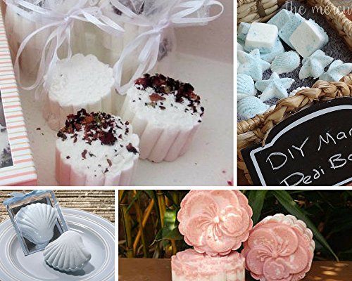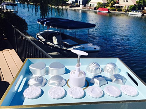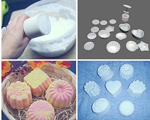 - 15 pieces DIY kit - 1 mooncake press mold 14*5cm, 6 beautiful stamps, 2 PCs Star, 2 PCs Heart shape mold, 2 PCs Jumbo Shell mold, 2 PCs medium Shell mold 7~7.5 cm * 1.5~4 cm. Create cupcake, Jelly, Pudding, and hold spices, and frizzy bathbomb.