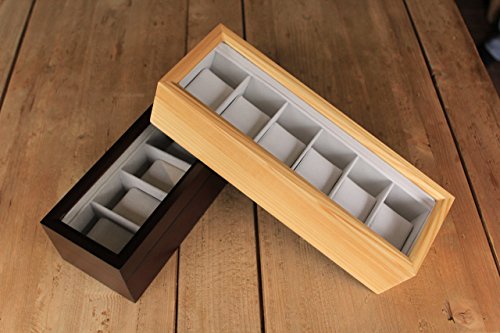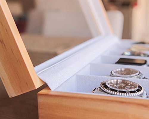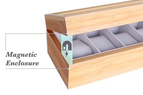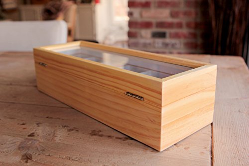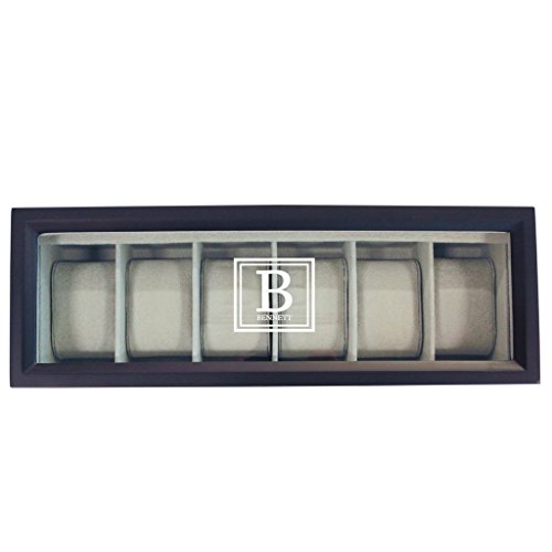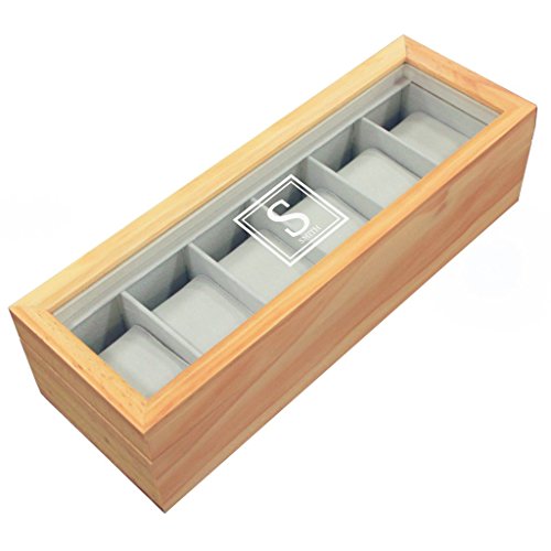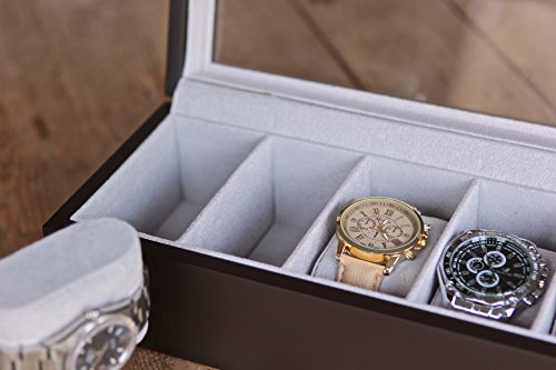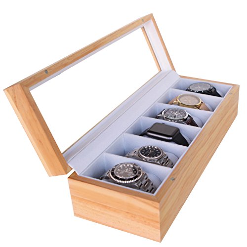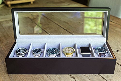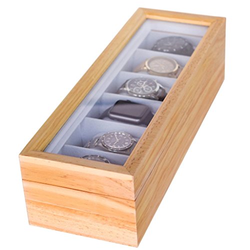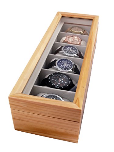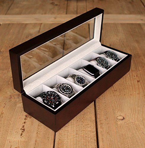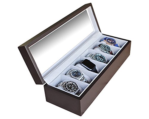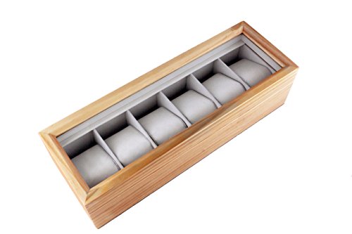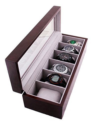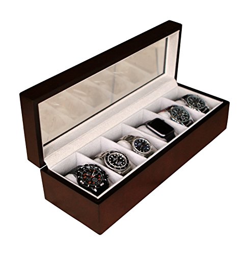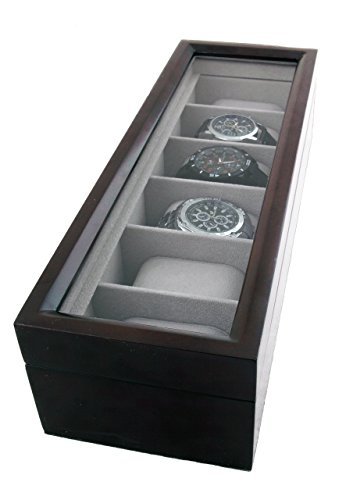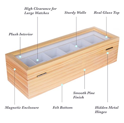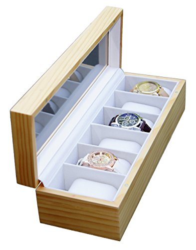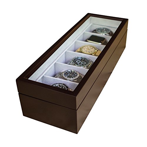Studio : case Elegance Publisher : case Elegance Binding : Watch Product Description Show them off. Bask in the glint of stones, sheen of metal and rich textured leather. This solid wood watch box will connect your horologic treasures to the relaxing spaces of your life. You will admire up to six fine timepieces through the real glass top. Your choice of natural dark espresso-finished or sustainable, light pine wood will easily fit on a dresser top, shelf or some other great vantage point in your home or office. Changing styles is easy because the hinged lid will stay up as long as you need, and when you close it, embedded magnets assure the lid stays in place. Felt pillows and interior lining assure that no harm will come to your investments. Each pillow fits most sizes and styles of watches, large and small, men's and women's. An inconspicuous felt bottom also prevents any furniture surface scratching. But, we think you won't have much reason to move it once you find the perfect spot. We know you'll love this product designed in the United States of America. 0