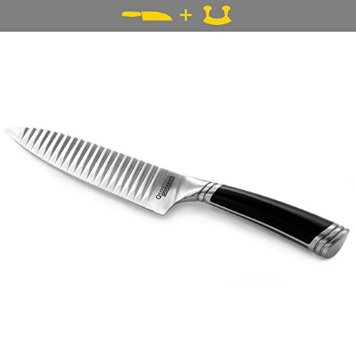 The CasaWare 6" Groovetech Chef Knife is so multi-functional that you will wonder how you survived without it. The 6" Chef Knife is great for chopping vegetables, cutting meats or slicing fruits. The 6" blade is perfect for both the Santoku and Mezzaluna cuts. The Full-Tang Japanese Stainless Steel blade's forged construction gives you superior quality and durability. The patented Groovetech technology creates a natural non-stick effect that pushes the food away from the blade and prevents it from sticking. The ergonomic handle is designed to fit comfortably in your hand and can be used for both left and right handed people. The knife has a 15 degree angle on each side of the blade. The Rockwell/Hardness is RC53. The blade can be sharpened in most traditional knife sharpeners that are sold in specialty/department stores.
