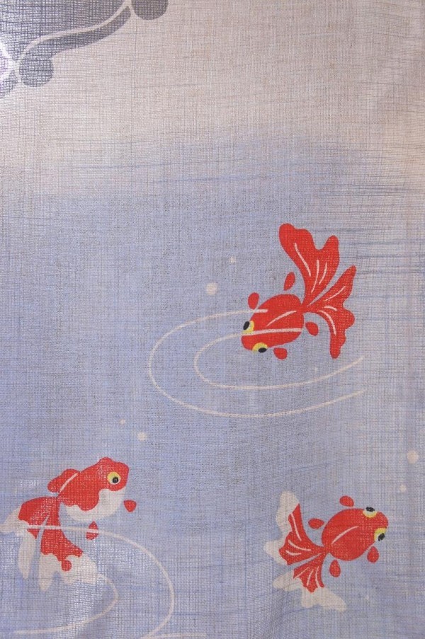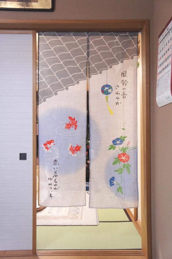 | 暑い日差しをよそに、冷たい水の中を優雅に泳ぐ金魚。風を受けてチリリと鳴る風鈴と、まだ少し涼しい朝のうちに咲く朝顔。夏の暑さを忘れさせてくれる風流なのれんです。麻のような風合いに仕上げました。 |