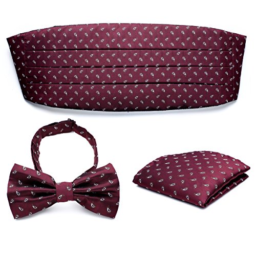 -. Feature : Formal Men's Silk Paisley Cummerbund Set with Pocket Square & Pre-tied Bow Tie / 1200 Count Needle &100% Handmade & Exquisite & High quality construction for multiple use / Size:Adjustable,Suitable for waist between 32" and 45.5".Bow tie 56 * 6.5(cm), Pocket Square 21.5 x 21.5(cm), Cummerbund 92.5 * 13.5(cm). / The Cumberband and bowtie is a Standard One Size Fits All. / Including: 1pc * Cummerbund, 1pc * Bow Tie, 1pc * Pocket Square