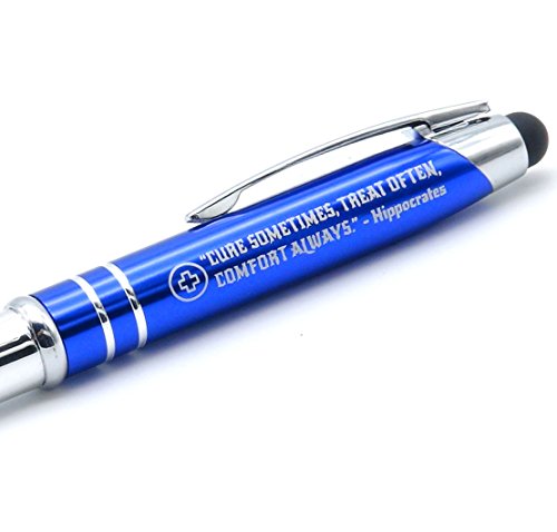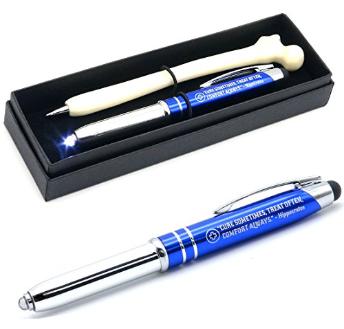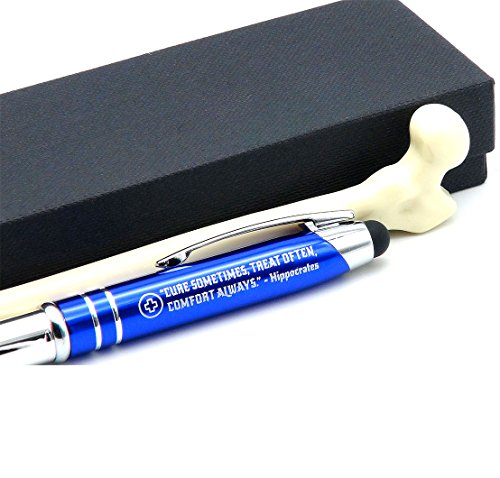 -. Feature : Included in this Duo Medical Gift Pen Set: Hippocrates quote engraved inspirational pen with LED Light and Human bone-shaped ballpoint pen / Engraved pen light reads, "CURE SOMETIMES, TREAT OFTEN, COMFORT ALWAYS - Hippocrates" / Black ballpoint writing tip is compatible with mini D-1 size ink cartridge refills / 3-in-1 multi-functional pen light includes an LED flashlight, and a stylus tip that can be used for smudge-free operation of phones, tablets, and other touch screen devices / Makes a suitable gift for nurse appreciation, doctor, medical assistant, or medical student graduation / Not intended for use as medical instruments