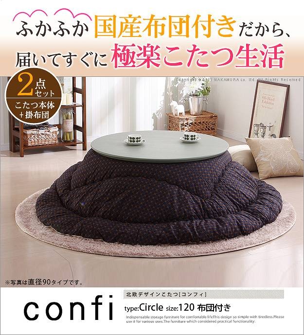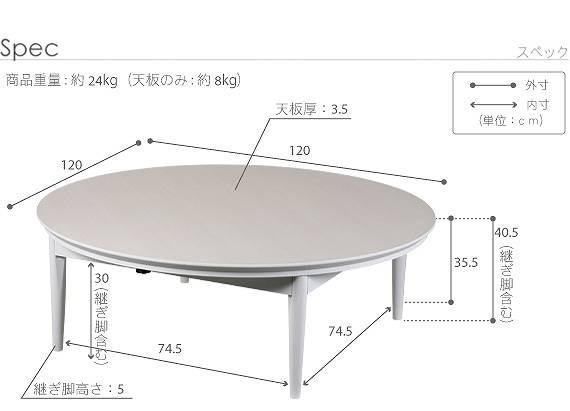 サイズ(cm):こたつ-120x120x34.5(丸型)・24kg、布団-幅205x奥行205・約1.8kg