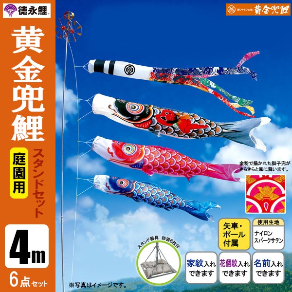 | 黄金兜鯉 庭園用大型鯉のぼり スタンド砂袋式ポール付セット | 1.5m鯉3匹 | 2m鯉3匹 | 3m鯉3匹 3m鯉4匹 3m鯉5匹 | 4m鯉3匹 4m鯉4匹 4m鯉5匹 |