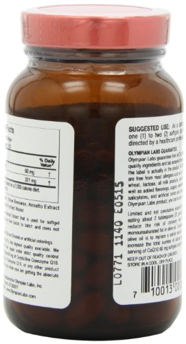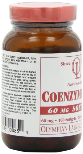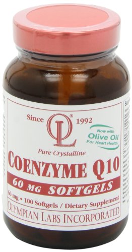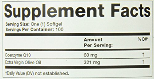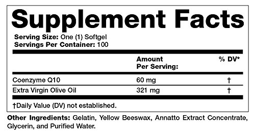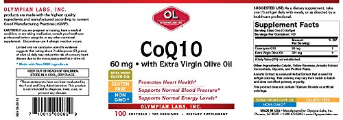 Limited and not conclusive scientific evidence suggests that eating about 2 tablespoons (23 grams) of olive oil daily may reduce the risk of coronary heart disease due to the monounsaturated fat in olive oil. To achieve this possible benefit, olive oil is to replace a similar amount of saturated fat to not increase the total number of calories you eat in a day. One serving of CoQ10 60 mg softgels contains 321 mg of olive oil.Feature