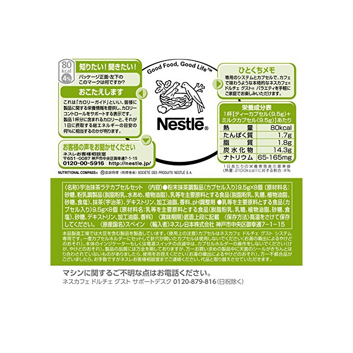 원재료:●분말 녹차 음료(캡슐 들어감)9.5g×8개: 설탕(폴란드)고, 분유 조제품(탈지분유,물엿,식물성 기름지)(독일)고, 젖 등을 주요 원료라고 하는 식품(탈지분유,유당,식물성 기름지,설탕,식염)(독일)고, 녹차,덱스트린(프랑스)고, 가공 유지(프랑스)고, 향료(스위스 미국)고, pH조정 제(독일) ●젖 등을 주요 원료라고 하는 식품(캡슐 들어감)9.5g×8개:{원재료명:젖 등을 주요 원료라고 하는 식품(탈지분유,유당,식염)(독일)고, 설탕(폴란드)고, 덱스트린(프랑스)고, 가공 유지(프랑스)고, 향료(미국)}