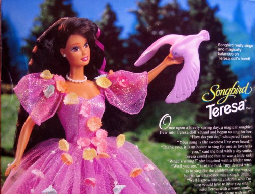 - Feature : Songbird Teresa Doll is a 1995 Mattel production. BIRD LOOSE in box/elastic disintegrated. / Included: 11.5" Teresa doll, outfit, singing songbird & cardboard accessory for songbird. / Teresa wears a gorgeous glittery mauve color gown w/colorful flowers. Songbird really sings & balances on your fingertips. Songbird does NOT talk. / For Ages 3+ Years. CAUTION: Small Parts Included. Sizes, Colors, Styles & Info may vary. / Songbird Teresa Doll is great for any collection or just for fun play! PLEASE check in CONDITION NOTE/Comments for the Box Condition.