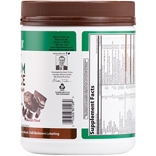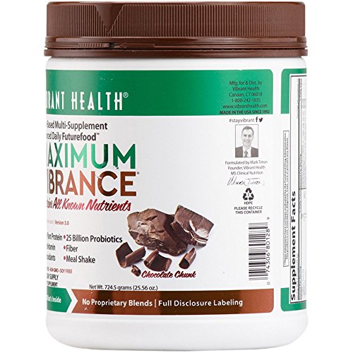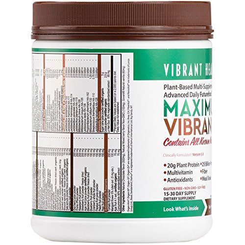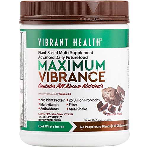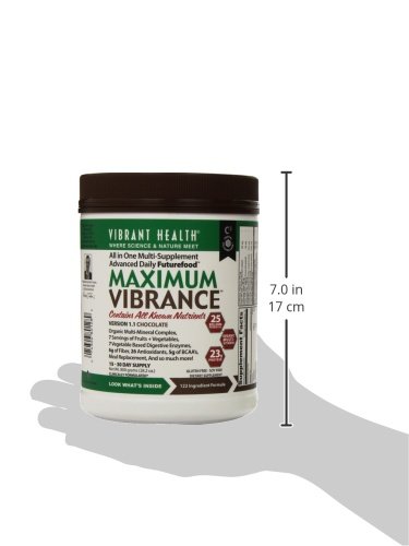 -. Binding : Health and Beauty -. Brand : Vibrant Health -. EAN : 0620023169265 -. Feature : ONE STOP NUTRITION: Coming closer than any other dietary supplement to being the singular product to take in place of all other supplements, the only absent nutrient from this formula are essential fats, in particular the omega-3 fatty acids. A stable form of powdered omega 3s that possesses a shelf life suitable for use in powdered supplements is yet to be developed. / HEALTH ON THE GO: It's a challenge to integrate the nutrients we need to feel our best into our busy day to day. Maximum Vibrance is a comprehensive solution, one scoop is an incredibly healthy and filling snack. Add two scoops to your smoothie and take your nutrition with you wherever the day may lead. / FUTUREFOOD: Maximum Vibrance is made up of over 100 ingredients from 80 plants, 29 antioxidants, 3g of fiber, 25 billion probiotics, 7 servings of fruits and vegetables, 7 vegetable based digestive enzymes, 20g of protein and much more. / DON'T SACRIFICE TASTE: The best dietary supplement in the world will do no one any good if it tastes awful. We use GoVanil Natural, a special extract of vanilla that blocks bitter flavors of foods, to help allow the other natural flavoring ingredients to be fully experienced and provide you with the great tasting nutrition you crave. / TRUTH, TRUST, TRANSPARENCY: You will find no misleading proprietary blends with Vibrant Health. We fully disclose each ingredient by dose in every product we manufacture. -. IsAdultProduct : 0 -. Label : Vibrant Health -. Manufacturer : Vibrant Health -. MPN : MAXC -. PackageQuantity : 1 -. PartNumber : MAXC -. ProductGroup : Health and Beauty -. ProductTypeName : HEALTH_PERSONAL_CARE -. Publisher : Vibrant Health -. Studio : Vibrant Health -. Title : Vibrant Health - Maximum Vibrance Chocolate - All in One Multi-Supplement Advanced Daily Futurefood, 15 servings -. UPC : 074306801289