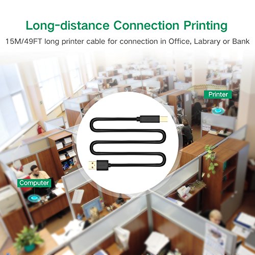 Ugreen USB 2.0 active printer cable is great for connecting your keyboard, mouse, scanner, hard drive, printer, server, camera and more, to a laptop, computer (Mac/PC) without signal loss up to 15m/49ft. With built-in signal booster chip in the middle of the cable, it ensures fast, clear transmission, free of line noise and other interference over long distances.