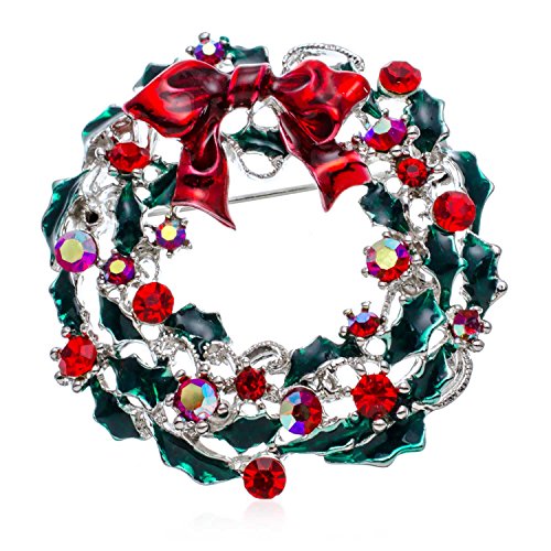 PAMMYJ OPEN RED BOW CHRISTMAS WREATH CRYSTAL BROOCH PIN