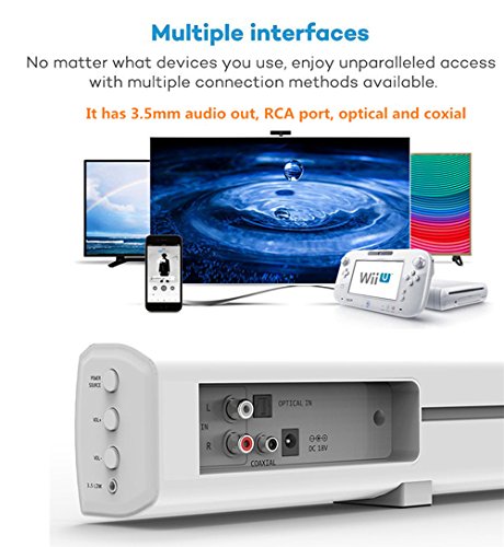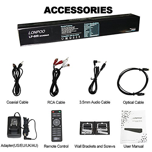 -. Feature : Metal Grill Surface Finishing & High Quality Panel, Wall Mountable / Super Bass Technology, Stereo audio system with high fidelity, Built-in advanced full range top quality speakers / Play Modes: Music, Movie, TV and are Easily selectable by the included full function remote control, requires battery (Battery Not Included) / Connection: Wireless Bluetooth 4.0, Optical, Coaxial, AUX1 (RCA 2CH), AUX2 (3.5MM) / Compatible with MP3/ TV/ PC/ Mobile Phone/ Portable Audio Players