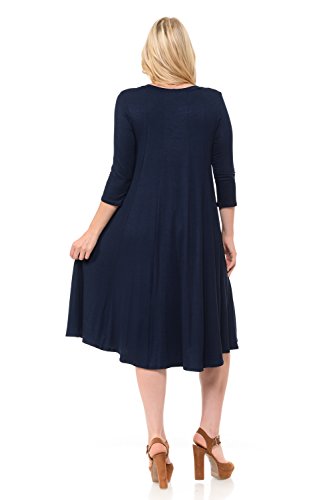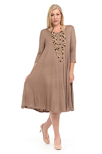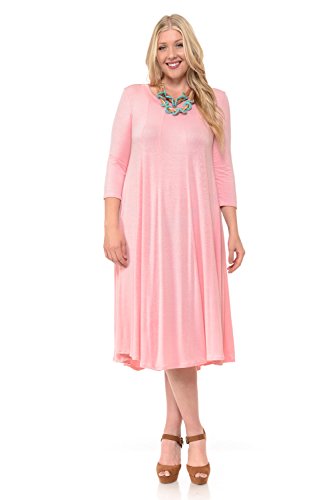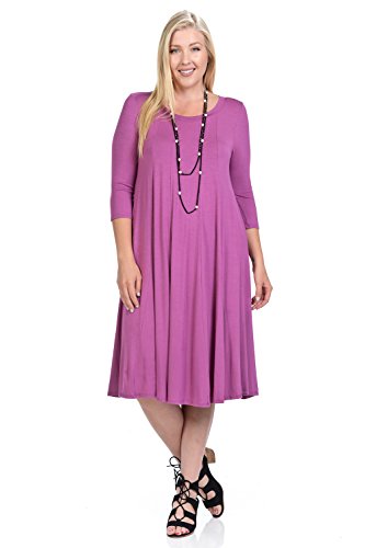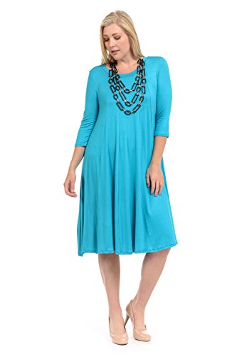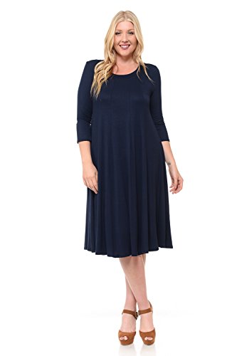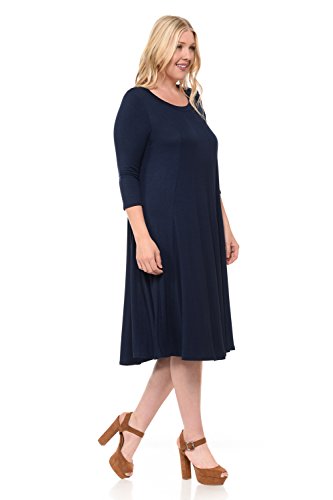 A-line plus size dress features a scoop neckline, 3/4 length sleeves, trapeze silhouette and midi length. This dress is made with knit jersey that is soft, drapes well and has great stretch.