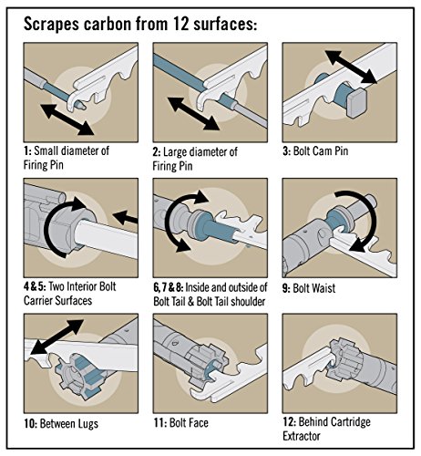 Binding : Sports Product Description A faster, easier way to clean the bolt carrier group. The Scraper removes heavy, baked-on fouling from 12 critical bolt carrier group surfaces faster and easier than brushes and solvent alone. It speed-cleans all four major parts of the bolt carrier group: the bolt, firing pin, bolt carrier and bolt cam pin. The swivel cover protects your hand from the double ended scraping edges. It's ideal for any workbench, cleaning kit, or range bag. 0