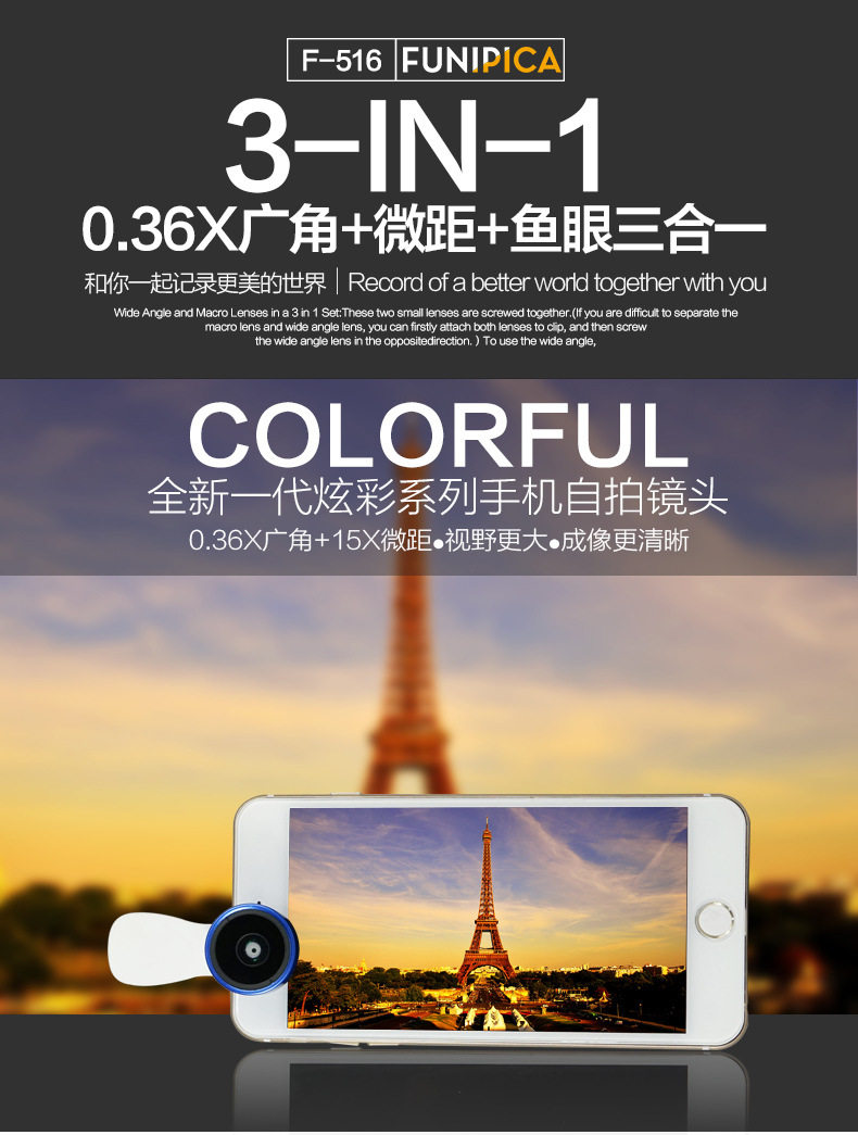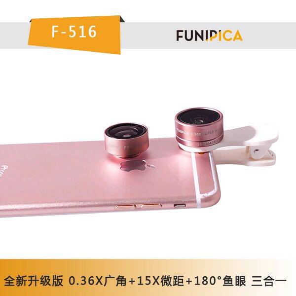 FUNIPICA F-516 0.36X Wide Angle + 15X Macro triple phone +180 degrees Fish eye lens