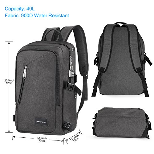 - Water resistance and scratch-proof Material - Soft lined laptop sleeve holds laptops less than 17 inches, offering enough space and great comfort. - External USB with built-in charging cable port offers a convenient charging of your electronic device anywhere. - Included metal zippers and a combination lock,which is theft proof and reliable,protecting wallet and other items inside from thief and offering a private space. - Backpack with adjustable shoulder strap, heavily padded, makes the backpack comfortable to wear.