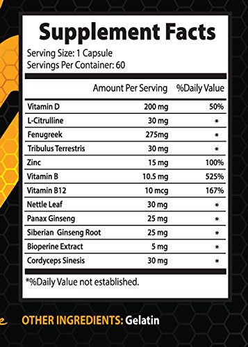 Studio : HS PRIME LLC Publisher : HS PRIME LLC Binding : Health and Beauty Product Description Male libido booster stimulant - TESTO BOOSTER 855MG - Low testosterone supplements men - 2 Bottles 120 Capsules LIBIDO BOOSTER: Is an amazing blend of natural APHRODISIACS . Its unick formula includes de following: Vitamin D, L-Citrulline, Fenugreek, Tribulus Terrestris, Zinc, Vitamin B6, Vitamin B12, Nettle Leaf, Panax Ginseng, Siberian Ginseng Root, Bioperine Extract, Cordyceps Sinesis. TESTOSTERONE BOOSTER: Provides assistance in increasing the testosterone levels. It will also be capable of improving muscle and libido growth with its unique formula. Among others, it is a natural, effective and safe supplement. SEX DRIVE BOOSTER: Can be helpful for: 1) Supporting healthy testosterone level 2) Endurance support 3) Fertility support 4) Increasing sex drive 5) Boosting Libido 6) Enhancing Energy 7) Improving sexual performance MUSCLE GROWTH: Is strong sexual tonic and immunity booster. It also has other health benefits that may be beneficial to both groups, used to enhance sexual performance, increase muscle mass and improve sex drive. 0
