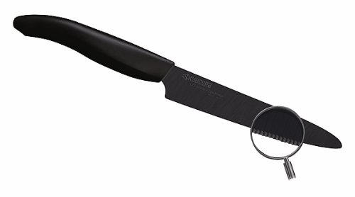 • Utra-sharp 5-inch ceramic micro-serrated utility knife with black blade; thinly slices tomatoes, fruits, and vegetables