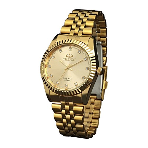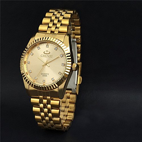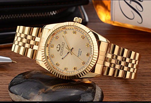 -. Feature : Since 1994,famous for it's good quality and reasonable prices.Genuine Brand,new with tag. / Gold color by IP plating technology,rhinestones hour-markers,show special gentleman taste. / Imported quartz movement,precise time display.Top quality steel material,wear comfortable. / High-strength wear-resistant mineral glass window,splash water proof,but keep off hot/warm water,and do not take it to swim and shower. / Package in box with label of DREAMING Q&P. Best choice as a present for friends and family.
