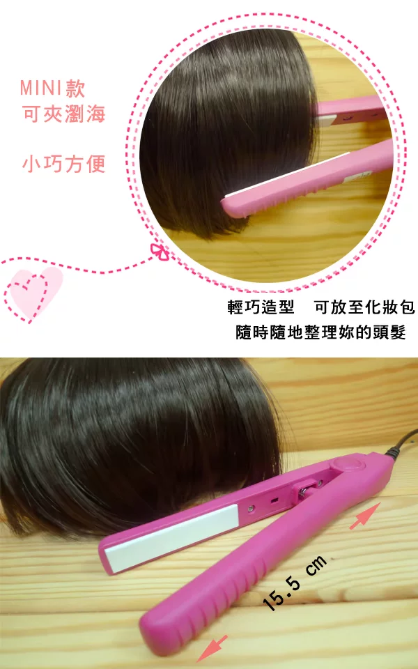 超迷你MINI離子夾,尺寸只有一般筆袋的大小喔~ 可直接放到化妝包或是皮包內隨身攜帶,超方便 1.2公分細面板,短髮瀏海都能夾得到唷~ 使用方法: 1. 將電源插上後,預熱2分鐘即可使用(面板的溫度高,請小心使用)。 2. 洗頭後將頭髮吹到約7~8分乾,再分區慢慢由上往下造型。 3. 如果擔心髮質受到傷害,建議可在使用前擦上護髮產品喔。 4. 電源拔掉後,請等待幾分鐘面板冷卻後再收起來就可以囉~ 注意事項: 1. 由於溫度很高使用中,請不要直接用手觸碰面板,以免被燙傷喔。 2. 請不要置於潮濕處,以免造成危險。 3. 請放置於兒童拿不到的地方,以免造成危險。 4. 使用完畢請拔除電源,請勿長時間插電,節省電源並可延長產品使用壽命。 電源:220V 面板尺寸:寬1.2X長6.1X厚度0.1 公分 機身全長約15公分(不含電源線)。 電源線:約145公分(含插頭)。 |