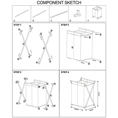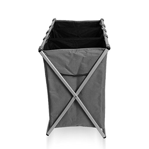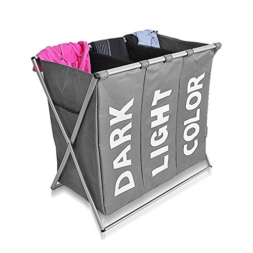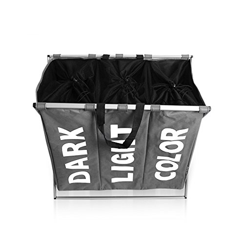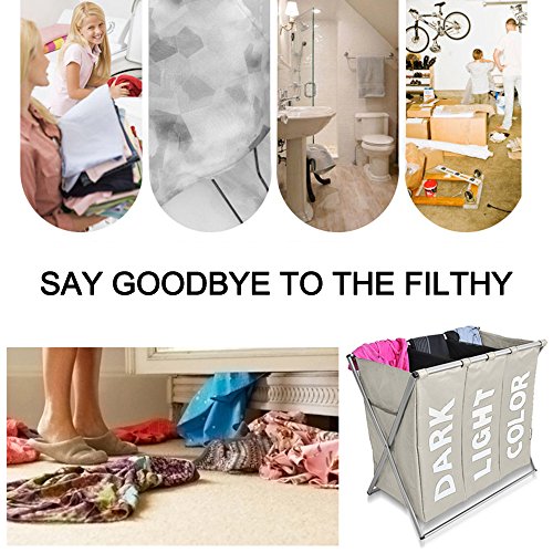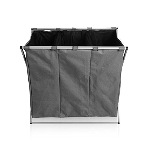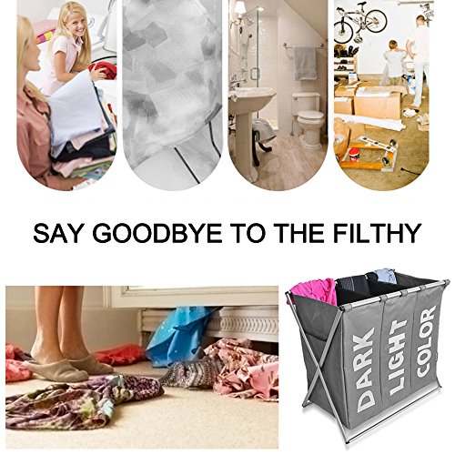 LOHOME 3 Section Laundry Basket Bag - 3 Bag Laundry Sorter Fabric Foldable Laundry Hamper With Alloy Frame Oxford fabric 24 x 22.4 x 15 inch (Grey)