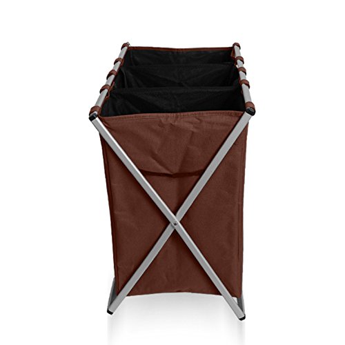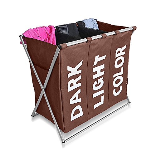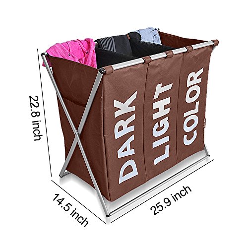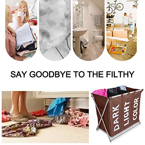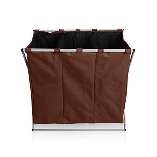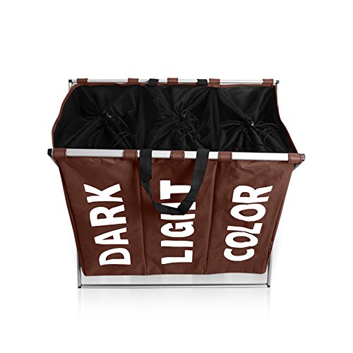 LOHOME 3 Section Laundry Basket Bag - 3 Bag Laundry Sorter Fabric Foldable Laundry Hamper With Alloy Frame Oxford fabric 24 x 22.4 x 15 inch (Coffee)