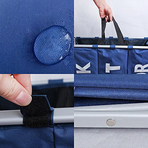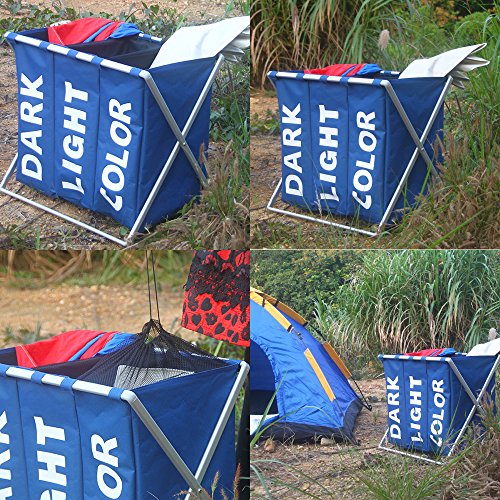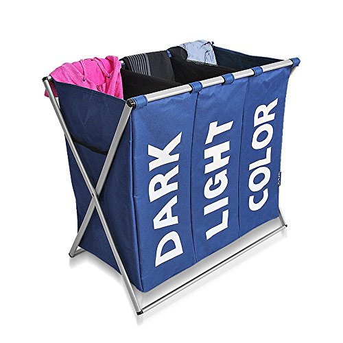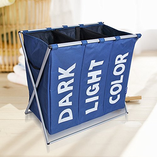 LOHOME 3 Section Laundry Basket Bag - 3 Bag Laundry Sorter Fabric Foldable Laundry Hamper With Alloy Frame Oxford fabric 24 x 22.4 x 15 inch (Blue)