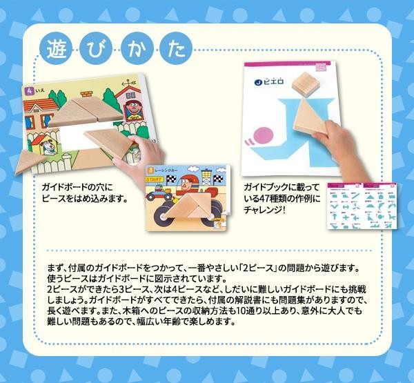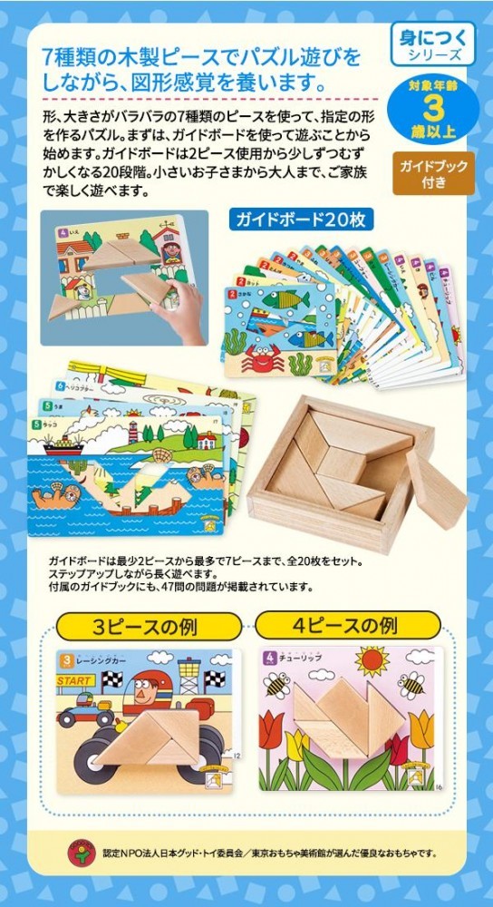 | セット内容 | 木製ピース7個、木箱、ガイドボード20枚(2~7ピースのステップアップ)、ガイドブック |
