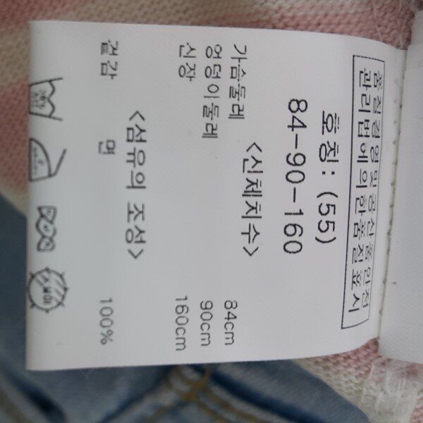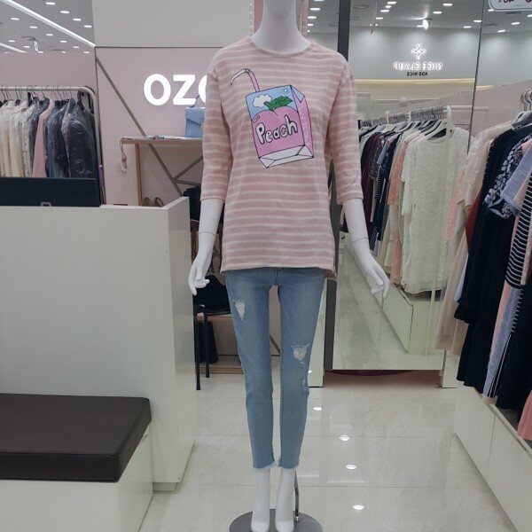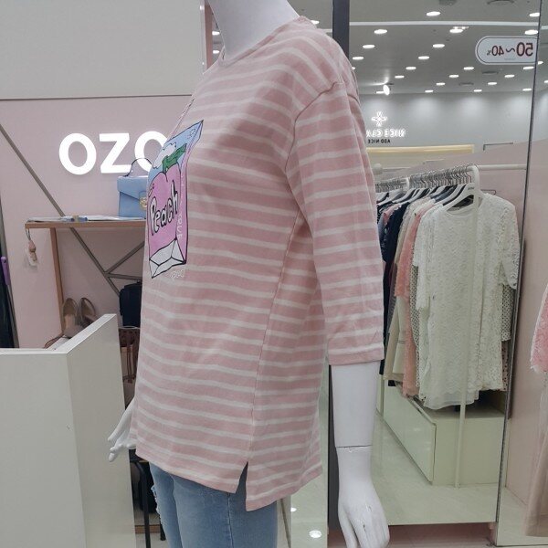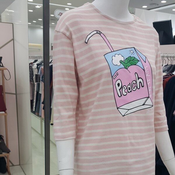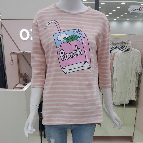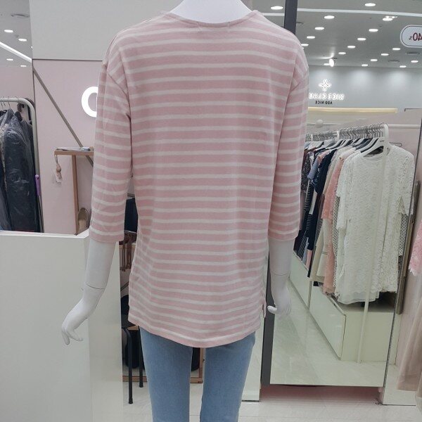 기본 라운드티셔츠인디핑크 의 귀여운 프린트와경쾌한 줄무늬7부소매예요