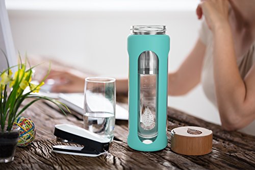 COMPACT, STYLISH BOTTLE & MADE FROM TOUGH BOROSILICATE GLASS for strength & durability. DOUBLE-WALLED to prevent condensation making a mess of things inside your bag. ECO-FRIENDLY BAMBOO LID with carry handle. Includes EASY-GRIP SILICONE SLEEVE. FOOD-GRADE STAINLESS STEEL FILTER HOUSING & LONG-LIFE FILTER - Each filter pouch lasts an incredible 300 cups/16 gallons/72 litres - which is about 30 days for the average person consuming 8 cups/64 ounces/2 litres of water per day.