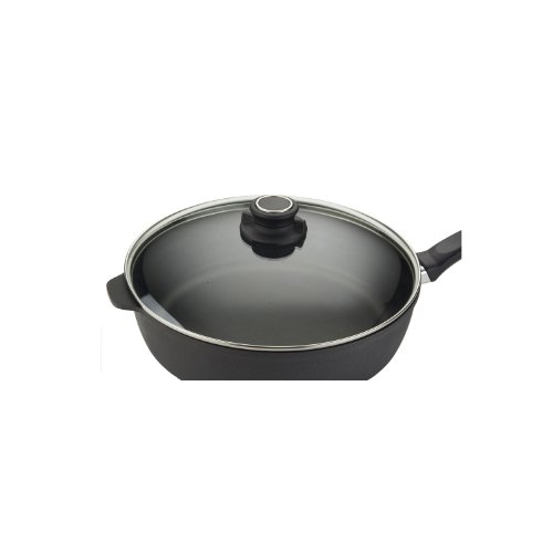 Swiss TITAN's versatile 11" Saute pan is a dream come true for any cooking enthusiast. Made by Swiss Diamond, Swiss TITAN's 4.3-quart (11 inch) Saute Pan is perfect for meat, vegetables, sauces, and more. Made in Switzerland, the cookware features a long-lasting, PFOA-free nonstick coating reinforced with titanium for years of effortless clean-up. The cast aluminum body will never warp and the perfectly flat base provides uniform heat distribution. The ergonomic handle is designed to stay cool on the stovetop. Manufacturing defects are covered through a 3 Year Limited Warranty.Feature