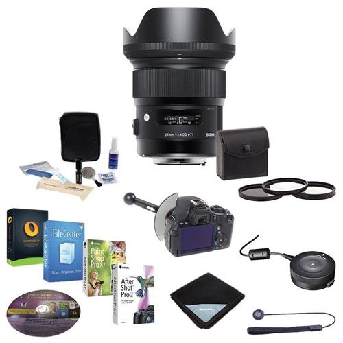 -. Feature : This Item Includes: Sigma 24mm f/1.4 DG HSM ART Lens - Front Lens Cap - Rear Lens Cap - Lens Hood - Case - Sigma 1 Year North and South America Limited Warranty (3 Year USA Extended Warranty for a Total of 4 Years from Date of Purchase) - 77mm Filter Kit (UV/CPL/ND2) - FocusShifter DSLR Follow Focus & Rack Focus - Lens Wrap (15x15) - Cleaning Kit - Sigma USB Dock for Canon Lenses- Lenscap Leash - Software Package (Includes Corel PaintShop Pro X7 & Corel AfterShot Pro 2 & Nuance OmniPage 18 & / Designed for full-frame DSLRs: and when used on digital cameras with an APS-C size image sensor, it effectively becomes a 38mm. The lens is ideal for capturing a variety of photography subjects, including cityscapes, mountain ranges, astrophotography and weddings and is great for videography work as well / Excels at indoor photography in low illumination: thanks to the combination of exceptional focal plane sharpness, and gorgeous bokeh rendered by nine rounded aperture blades. The lens achieves a maximum magnification of 1:5.3 with a minimum focusing distance of 9.8 inches. / Incorporates both "F" Low Dispersion (FLD) glass and Special Low Dispersion (SLD) glass: in a design of 15 elements in 11 groups to minimize chromatic aberration of magnification especially in the edge of the image field. / Optimized power layout: includes aspherical elements that are positioned in the rear of the lens for improved wide open performance. This helps to ensure minimal distortion through the correction of axial chromatic aberration and sagittal coma flare. The new lens element design also delivers excellent peripheral brightness.