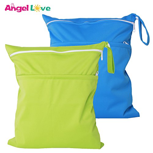 Wet Bags, Angel Love 2 Pack Baby Cloth Diaper Wet/Dry Bags with Two Zippered Pockets, Travel, Beach, Pool, Gym Bag for Swimsuits or Wet Clothes,...