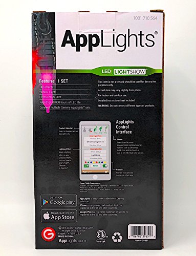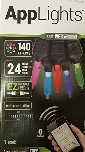 -. Binding : Kitchen -. Brand : Gemmy -. Color : Multicolor -. EAN : 0008678601475 -. Feature : Total Length 24 1/2' - Lighted Length 23' - / Set of 24 Bright, energy-efficient LEDs lights that are rated for 20,0000 hours of life / AppLights lets you control the light show from your phone from up to 50 ft. away. / Connect up to 18 Gemmy applights sets for even more illumination. / Create 140 effects for a customized display. -. IsAutographed : 0 -. Label : Gemmy -. Manufacturer : Gemmy -. Model : 10017105556 -. MPN : 11430 -. PartNumber : 11430 -. ProductGroup : Home -. ProductTypeName : HOME -. Publisher : Gemmy -. Size : 24 -. Studio : Gemmy -. Title : Applights 24 count smooth mini bulb 140 effects 23ft -. UPC : 008678601475