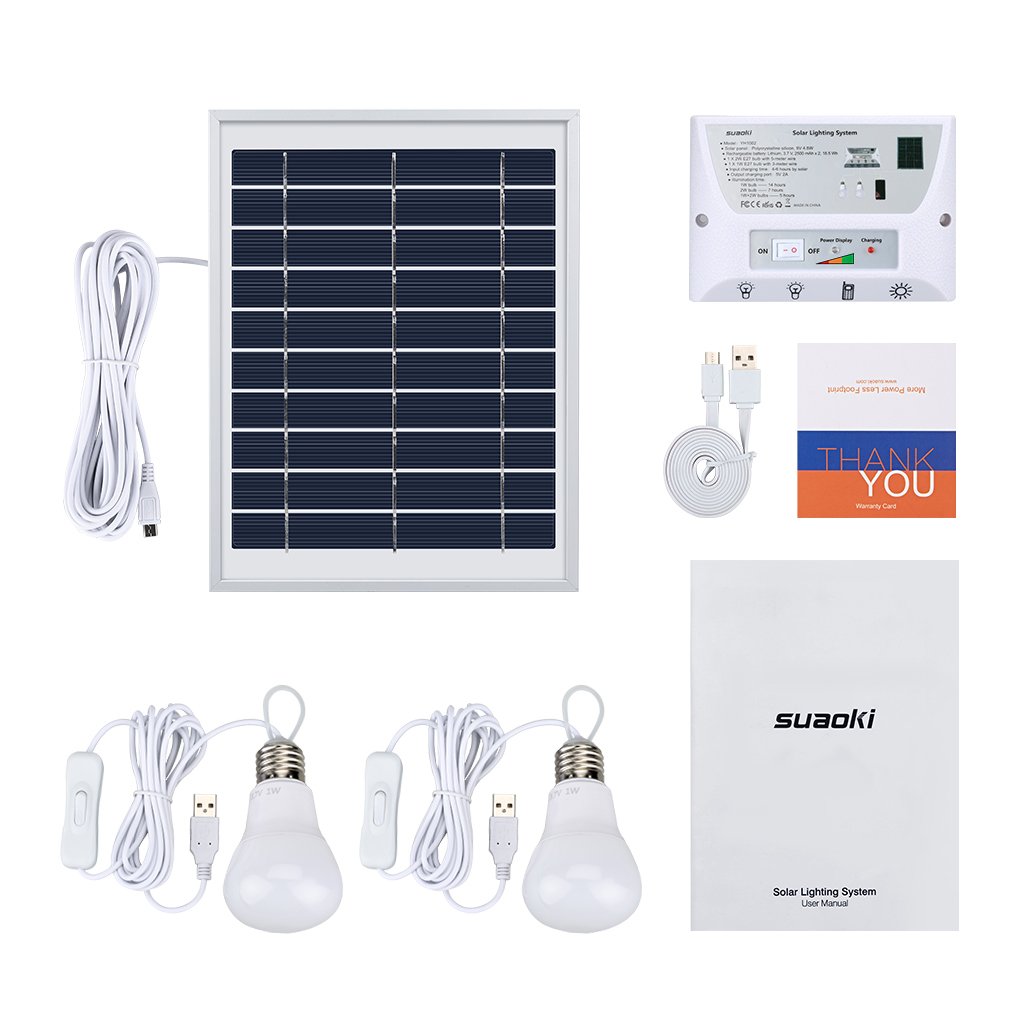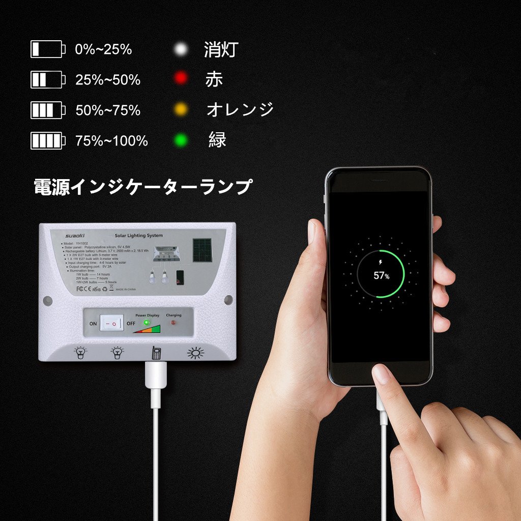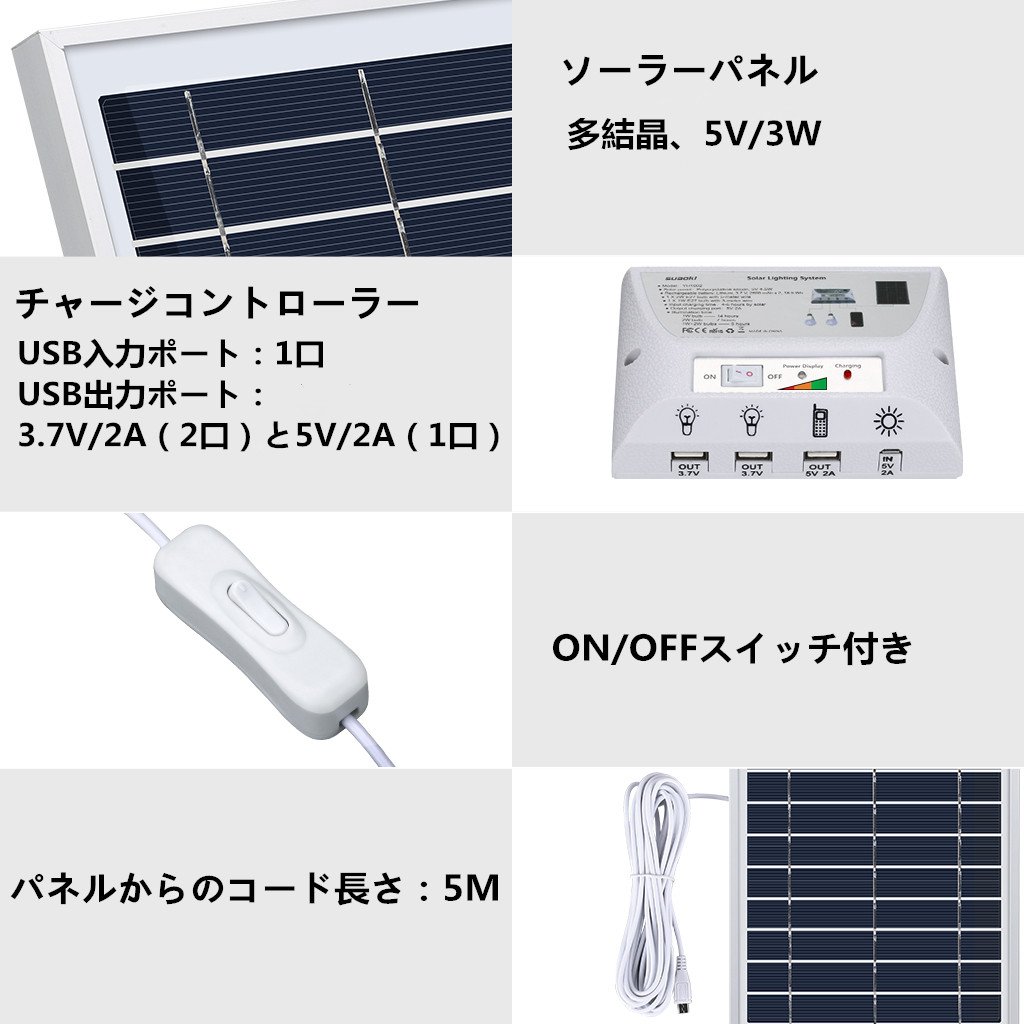 A polycrystalline solar panel with high power generation efficiency, a built-in 5000 mAh rechargeable battery that stores electricity, a power transmission panel that controls stored electricity, a full set of high-brightness LED bulbs and a USB cable for smartphone charging!