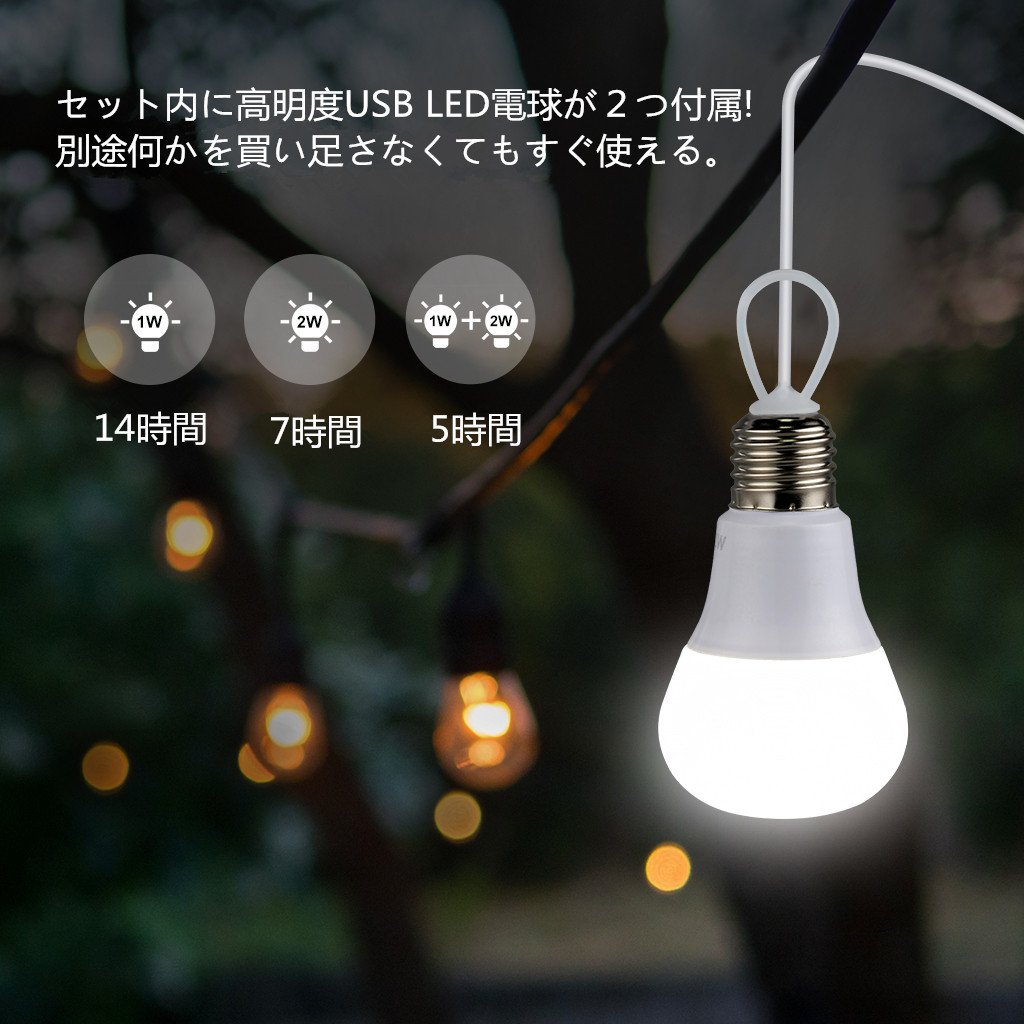 2 W bulb: USB cord length 5 m, capable of lighting for 7 hours with full charge