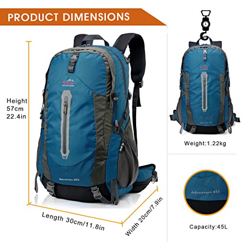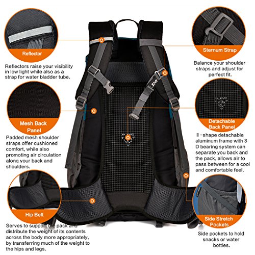 -. Feature : MATERIAL- Polyester , Breathable mesh shoulder straps ,Water-resistant Polyester as the fabric do not allow water to easily penetrate. RAIN COVER included. / CAPACITY- 45L (2,746 cube inches); High quality professional backpack for camping, hiking and climbing, designed to be comfortable and functionally versatile. / MULTIPLE FEATURE- SBS zipper, Reflective strip design, higher safety factor for night; more humane, more convenient for travelling. / VERSATILE-Ultra-light, Ultra-durable, Ultra-awesome daypack.Perfect for hiking,climbing, camping, travel,day-to-day use, college, etc. / GRID BEARING SYSTEM- 3D bearing system , promoting air circulation along your back.