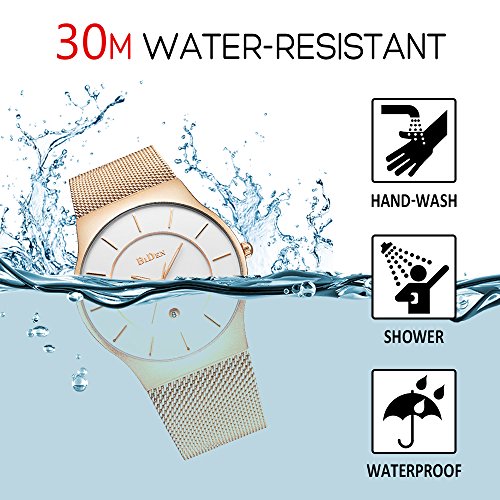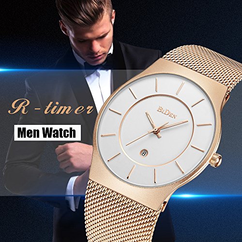 R-timer(R 타이머)손목시계 맨즈 아날로그 방수 비지니스 쿼츠 워치 초박형 패션 손목시계 메쉬 밴드 날짜 표시 (골드-1)