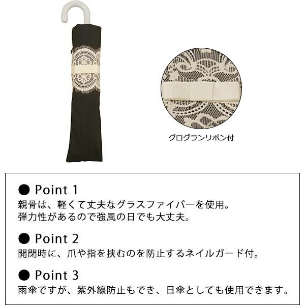 fk094igrjs繊細なレースプリントに、グログランリボンを施した、上品なデザインです サイズ (約)親骨:50cm(2段折)、傘の直径:84cm、収納時:36cm 個装サイズ:7.0×36.0×6.0cm 重量 約220g 個装重量:230g 素材・材質 親骨:グラスファイバー(8本使用) 生地:ポリエステル 仕様 開閉:手開き 生産国 中国 レースデザインの、2段折りたたみ傘 繊細なレースプリントに、グログランリボンを施した、上品なデザインです