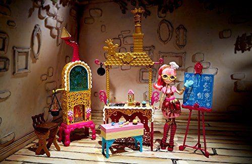 Play set includes delightful pieces like a cooking table and gilded oven with working doors