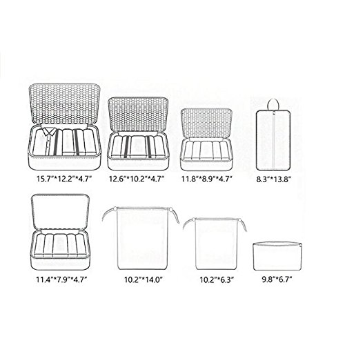 Size Details: 4 Luggage Cubes: Extra Large(15.7"x 12.2"x 4.7") & Large(12.6"x 10.2"x 4.7") & Medium(11.8"x 8.9"x 4.7") & Small(11.4"x 7.9"x 4.7"); 2 Laundry Pouch: Medium(14.0"x 10.2") & Small(10.2" x 6.3"; 1 Shoes Bag:(13.8"x 8.3"); 1 Cosmetic Bag(9.8" X6.7")
